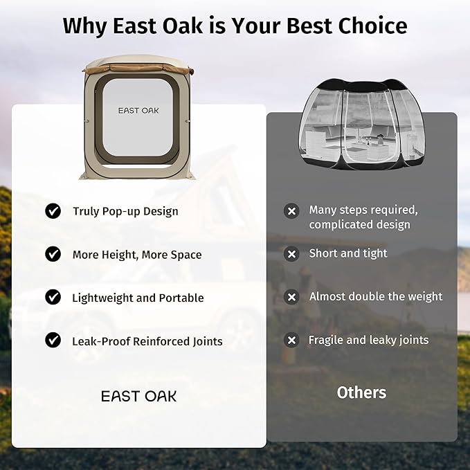 • ๐—ฉ๐—ฒ๐—ฟ๐˜€๐—ฎ๐˜๐—ถ๐—น๐—ฒ ๐—”๐—น๐—น-๐—ถ๐—ป-๐—ข๐—ป๐—ฒ ๐—ง๐—ฒ๐—ป๐˜: Engineered for complete outdoor protection, our tent features bug-proof mesh, waterproof walls, and wind-resistant construction. The expandable design offers extra space when needed, while vehicle-connect capability turns your car into a basecampโ€”delivering 360ยฐ coverage for all your adventures. One EAST OAK tent outperforms three ordinary tents.