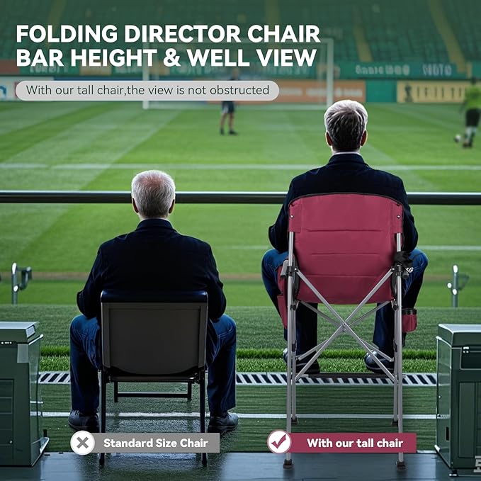 • Wider View and Knee-Friendly: Our tall foldable directors chair for adults has a total height of 50 inches, made of thickened heavy-duty steel pipe and 600D Oxford cloth, which can support up to 400 pounds, is tall enough, has a wide field of view, and is very suitable for people with poor knees who cannot sit on standard chairs, also good for elderly people