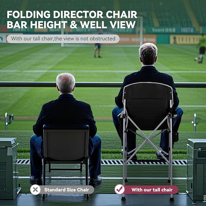 • High Folding Chair: The unfolded size of the director's chair is 50 inches high x 24 inches wide x 28 inches deep, the seat height is 31 inches, sit on our bar height tall foldling chairs, giving you better visibility and activity space, it's convenient for you to get in and out. Equipped with an Oxford cloth cup holder and a multi-functional storage bag, it is very suitable for putting on makeup in the locker room, and also very suitable for tall people to watch the game outdoors