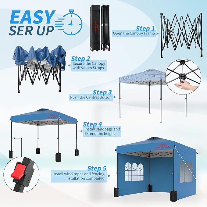 10x10 Pop Up Canopy with Sidewalls, Easy Up Canopy Tent, Heavy Duty Tents for Parties, One Person Set Up Event Tent, Light Blue