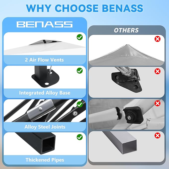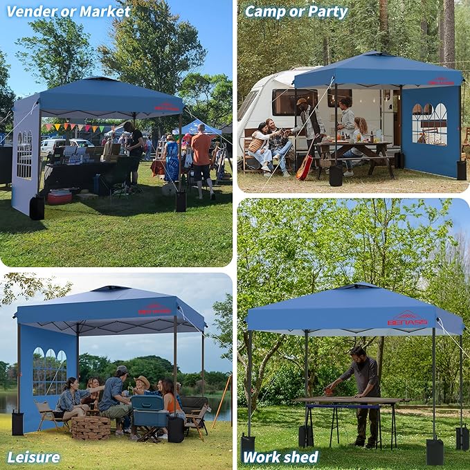 • Ideal Size & Large Room - We use straight leg design to maximize the use of space. Overall size is 10'L x 10'L x 9.2'H (8.53'-8.86'-9.2'). It's large enough for 8-10 person and enough to put tables, chairs, and others, perfect for party, camping, event and vendor