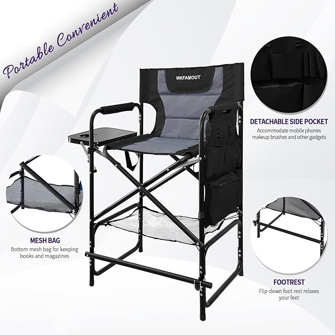 Tall Folding Directors Chair with Side Table 30.71" Seat Height Foldable Camping Chair Bar Stool for Makeup Artist Face Painting with Footrest and Storage Pocket Supports 350LBS