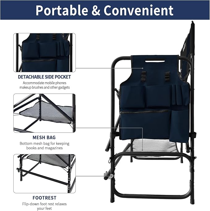 • Ideal Work Assistant: The high folding chairs 26.77" seat height, it allows you to elevate your position. Better seeing the full field and mastering the audience .Tall camping chairs also allow you to do better makeup and work.