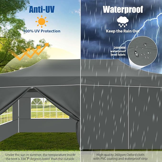 • 🏆【Upgrade 6 Removable Sidewalls】Our 10x20 commercial canopy come with 6 removable sidewalls(4 sidewalls with window+2 sidewalls with doors). 210D polyester with PU lining, which is 100% waterproof and able to block 99% UV sun rays.Elegance church windows design provide you more brightness and excellent scenery outside. Also, you could DIY the sidewalls to meet your different needs. With the help of Hook-and-loop fastener straps, sidewalls are easy to install and remove.