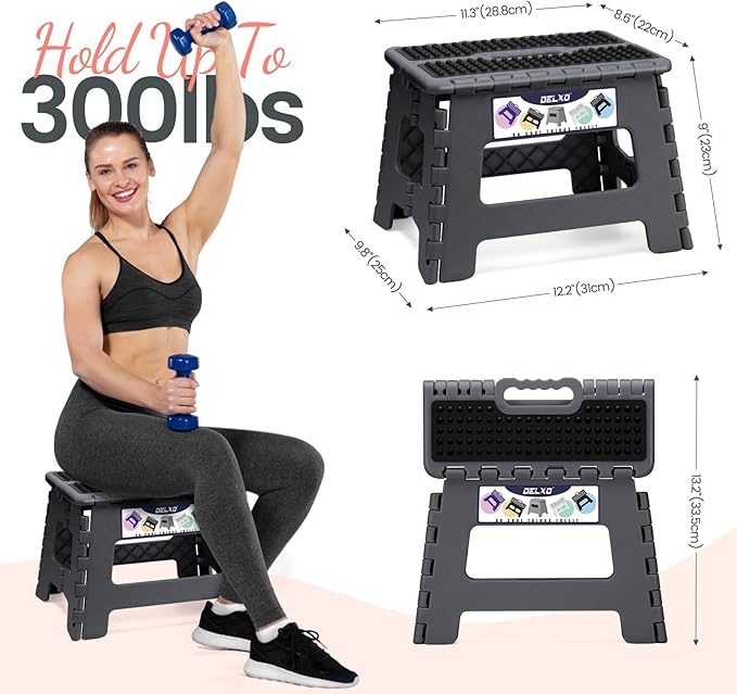 Delxo Folding Step Stool 9 Inch,Non-Slip Foldable Stools for Kids & Adults Up to 300 LBS,Kitchen Collapsible Fold Up Stepping Stool with Dotted 1 Pack,Gray