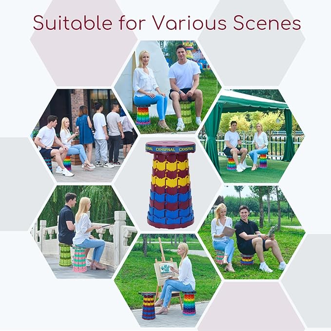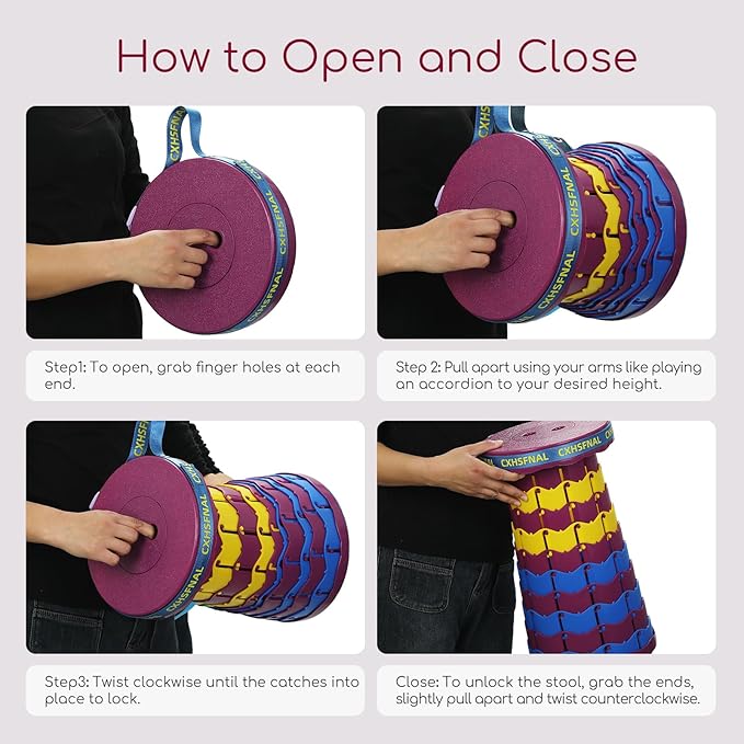 • 【Easy to Use, in Style】: The folding stool opens and closes nicely and quick by grabbing finger holes at each end and using your arms like playing an accordion. When pulled open to full extension, a slight twist unlocks it to allow collapsing for transport and/or storage. No assembly required. The fold up stool is also easy to carry or attach to a bag. The colorful portable folding stool is adequate in style.
