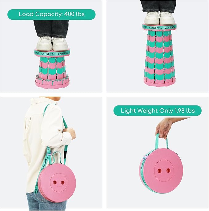 • 【Easy to Use, in Style】: The folding stool opens and closes nicely and quick by grabbing finger holes at each end and using your arms like playing an accordion. When pulled open to full extension, a slight twist unlocks it to allow collapsing for transport and/or storage. No assembly required. The fold up stool is also easy to carry or attach to a bag. The colorful portable folding stool is adequate in style.