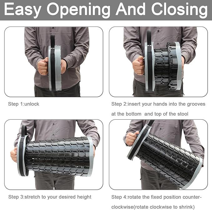 • 【US patent Deisgn】XXL Collapsible Stool with cushion Height 50cm/19.7" D 30cm/11.8" Weight:1.5kg/3.5lbs Crafted with upgraded thickened plastic,our collapsible stools for adults boast unrivaled strength,Safety,and Stability,More sturdy,supporting up to 1000 pounds.With its patented design and multiple locking mechanisms,sit securely and comfortably in any situation.