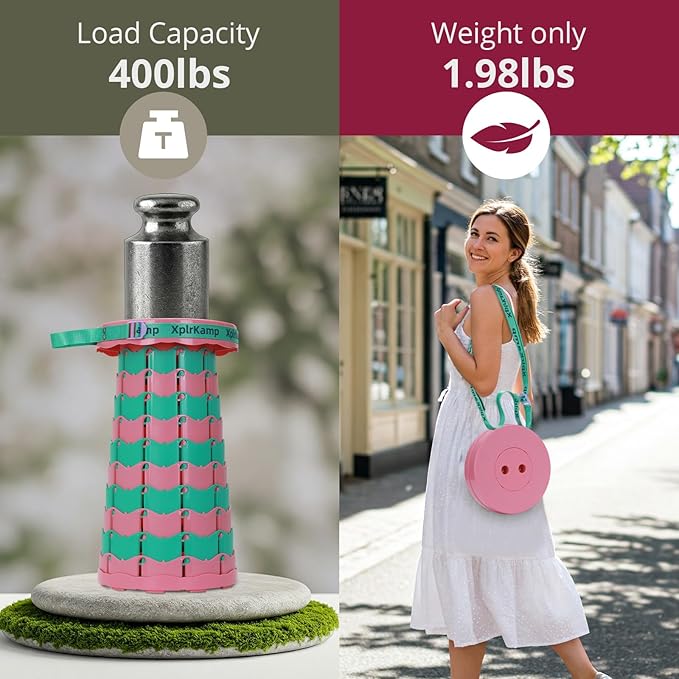 • Multi-Scenario : This collapsible stool transitions effortlessly from camping, hiking, fishing, and picnics to indoor/commuter use (offices, concerts, subway queues). With a telescopic design that fits in backpacks, it solves space constraints for DIY projects, plumbing work, gardening, and gift-giving occasions – weighing only 1.98lbs yet supporting 400lbs
