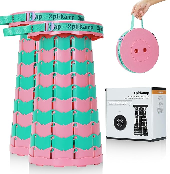 Retractable Folding Stool - Heavy Duty 400 lb Collapsible Portable Stool for Camping, Hiking, Fishing, Indoor/Outdoor with Non-Slip Base and Lightweight Design (Pink Green, 2-Pack)