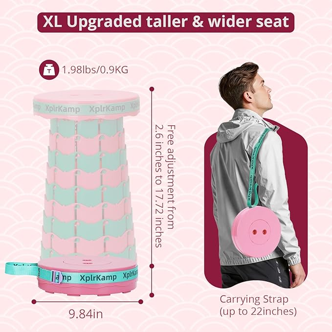 • Foldable & Portable: The XplrKamp foldable stool weighs only 1.98 lbs (0.9kg) with a collapsible size of 2.56"×9.84" (6.5×25cm).Features a 22-inch adjustable strap for shoulder carry or backpack attachment. Ideal as a camping stool for hiking, fishing,outdoor painting and picnics, while fitting seamlessly in cars, closets, or small spaces