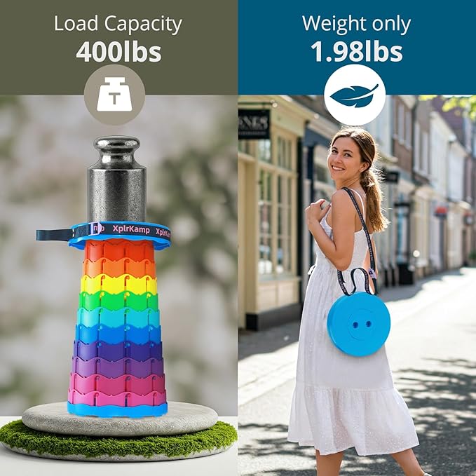 • Foldable & Portable: The XplrKamp foldable stool weighs only 1.98 lbs (0.9kg) with a collapsible size of 2.56"×9.84" (6.5×25cm).Features a 22-inch adjustable strap for shoulder carry or backpack attachment. Ideal as a camping stool for hiking, fishing,outdoor painting and picnics, while fitting seamlessly in cars, closets, or small spaces