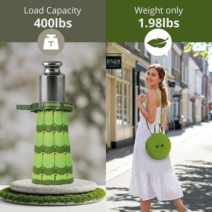 • Foldable & Portable: The XplrKamp foldable stool weighs only 1.98 lbs (0.9kg) with a collapsible size of 2.56"×9.84" (6.5×25cm).Features a 22-inch adjustable strap for shoulder carry or backpack attachment. Ideal as a camping stool for hiking, fishing,outdoor painting and picnics, while fitting seamlessly in cars, closets, or small spaces