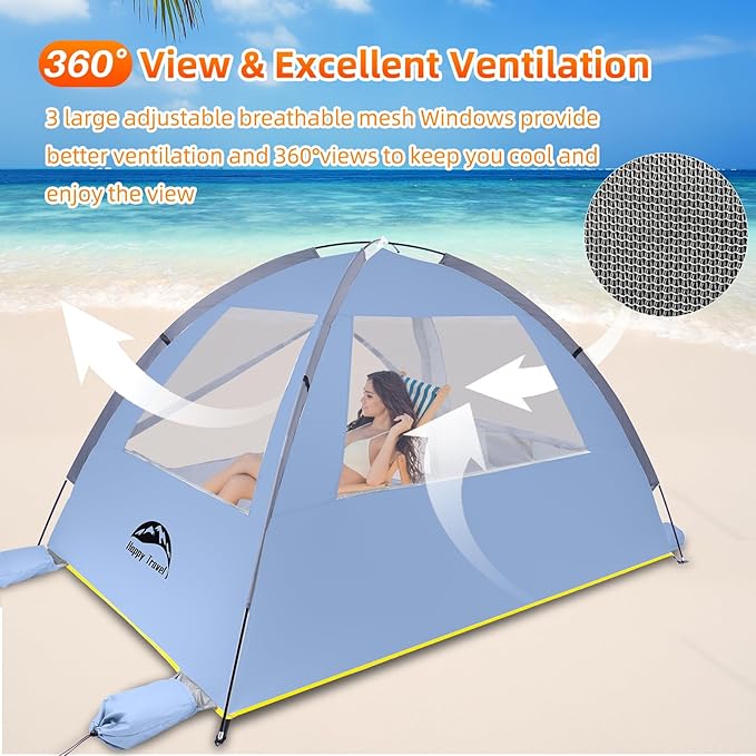 • 【Excellent Ventilation & Views】The beach tent sun shelter adopts a four-side ventilation design, equipped with a zippered door and three adjustable large ventilation windows with screens. Moreover we increased the height of the door and added a screens on the doors. It has a sand-proof effect, not only providing great ventilation, Keep cool all the time, but also gives you a better views appreciation of the beautiful beach scenery.