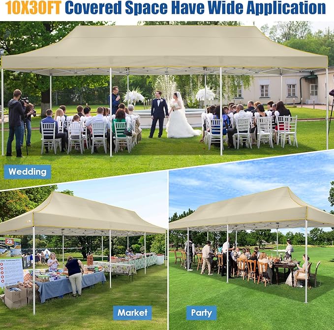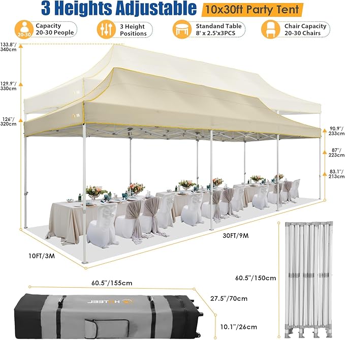 • 🏆【𝟔𝟎𝟎𝐒𝐪𝐟𝐭 𝐋𝐚𝐫𝐠𝐞 𝐒𝐩𝐚𝐜𝐞 & 𝟑 𝐀𝐝𝐣𝐮𝐬𝐭𝐚𝐛𝐥𝐞 𝐇𝐞𝐢𝐠𝐡𝐭𝐬】 HOTEEL 10x30 pop up canopy provides 600 sqft spacious covered space and 3 adjustable heights for your choice, it can easily accommodate 25-30 people, meet your different needs for holding large gatherings. Perfect for wedding, birthday party, commercial activities and other larger events, also this canopy 10x30 can use as a carport.