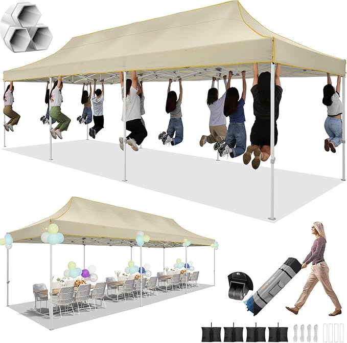 HOTEEL 10x30 Pop up Canopy Tent for Parties, Heavy Duty Easy Setup Tent Without Sidewalls, Outdoor Commercial Instant Gazebo for Wedding Event, with Portable Bag, Khaki(Hexagonal Frame)