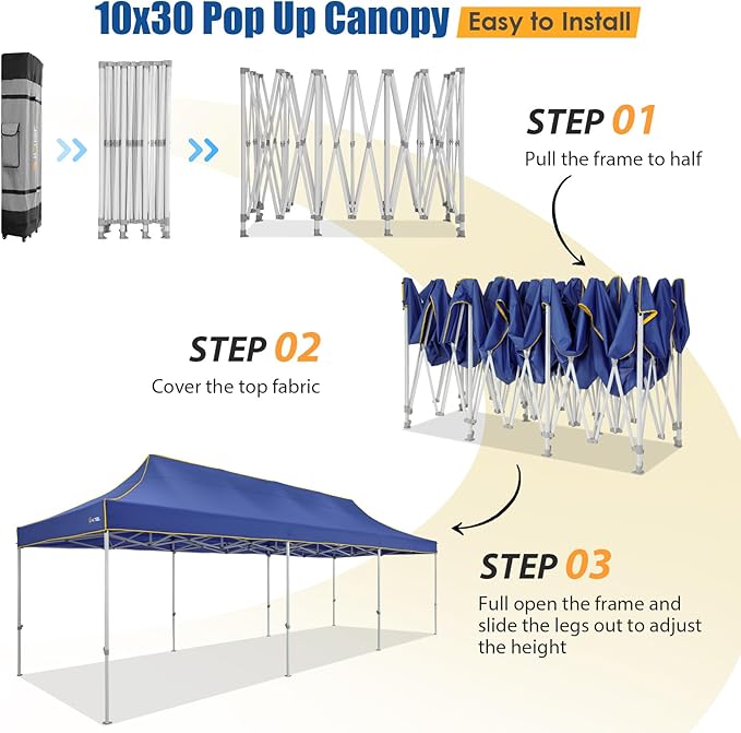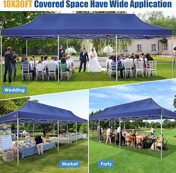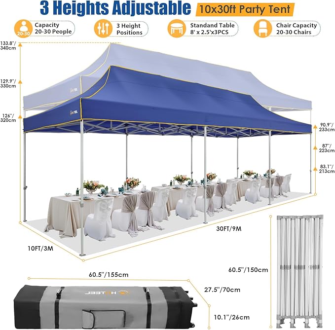 • 🏆【𝟔𝟎𝟎𝐒𝐪𝐟𝐭 𝐋𝐚𝐫𝐠𝐞 𝐒𝐩𝐚𝐜𝐞 & 𝟑 𝐀𝐝𝐣𝐮𝐬𝐭𝐚𝐛𝐥𝐞 𝐇𝐞𝐢𝐠𝐡𝐭𝐬】 HOTEEL 10x30 pop up canopy provides 600 sqft spacious covered space and 3 adjustable heights for your choice, it can easily accommodate 25-30 people, meet your different needs for holding large gatherings. Perfect for wedding, birthday party, commercial activities and other larger events, also this canopy 10x30 can use as a carport.