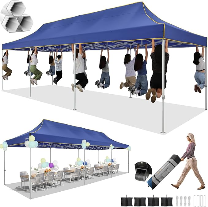 HOTEEL 10x30 Pop up Canopy Tent for Parties, Heavy Duty Easy Setup Tent Without Sidewalls, Outdoor Commercial Instant Gazebo, with Portable Bag, Dark Blue(Hexagonal Frame)