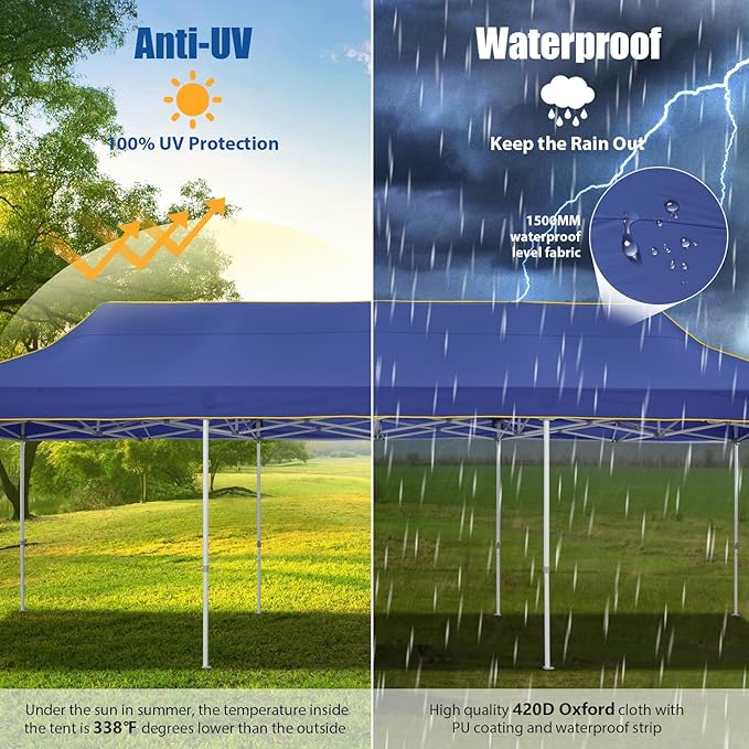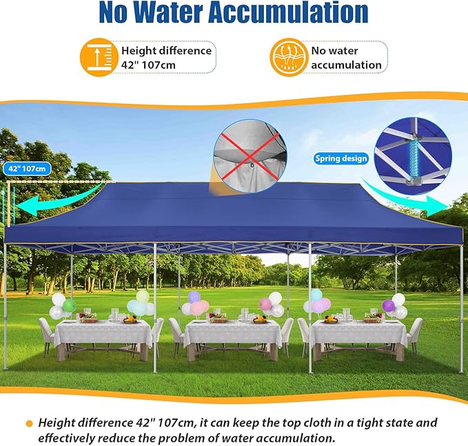 • 🏆【𝐀𝐧𝐭𝐢-𝐖𝐚𝐭𝐞𝐫 𝐀𝐜𝐜𝐮𝐦𝐮𝐥𝐚𝐭𝐢𝐨𝐧 & 𝐀𝐧𝐭𝐢-𝐔𝐕】 Super durable pop up canopy top made with 420D Oxford fabric with PVC coating and waterproof strip to ensure 99% UV protection, 1500MM water resistance, and cooler shade area. Under the work of the height difference 42", it can keep the top cloth in a tight state and effectively reduce the problem of water accumulation.