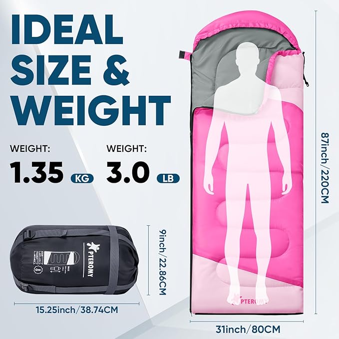 PTEROMY Sleeping Bags for Adults, Lightweight Water Resistant Backpacking Camping Sleeping Bag for Warm Cold Weather, Camping Essentials for Hiking Outdoor Travel