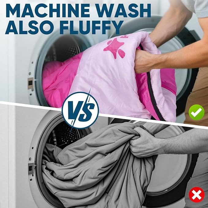 • Machine Washable: Crafted with double S-shaped stitching and Hollowfiber cotton filling, this sleeping bag is both water-resistant and windproof; The spun cotton inner lining ensures softness and warmth, maintaining its thermal efficiency even after machine washing without clumping
