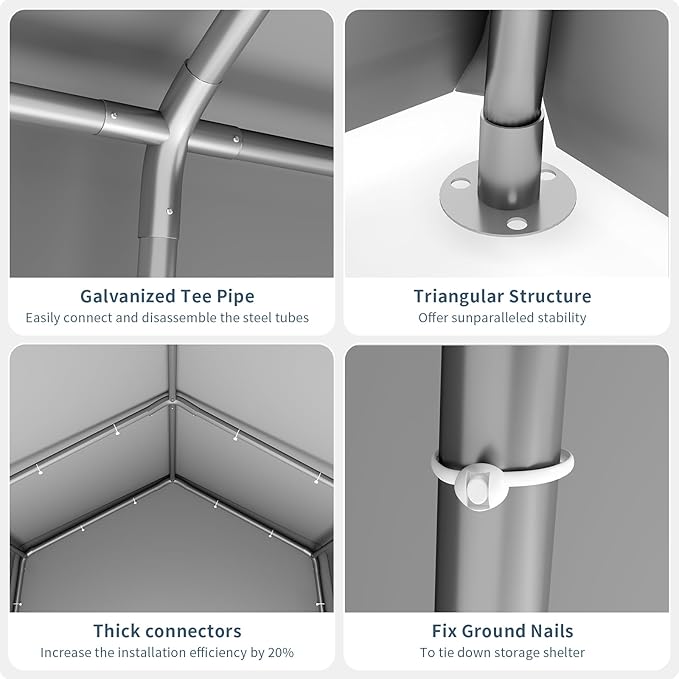 • 【Easy Tool-Free Assembly】: The 6 ft x8 ft storage shelter features a tool-free frame design, making installation fast and hassle-free.