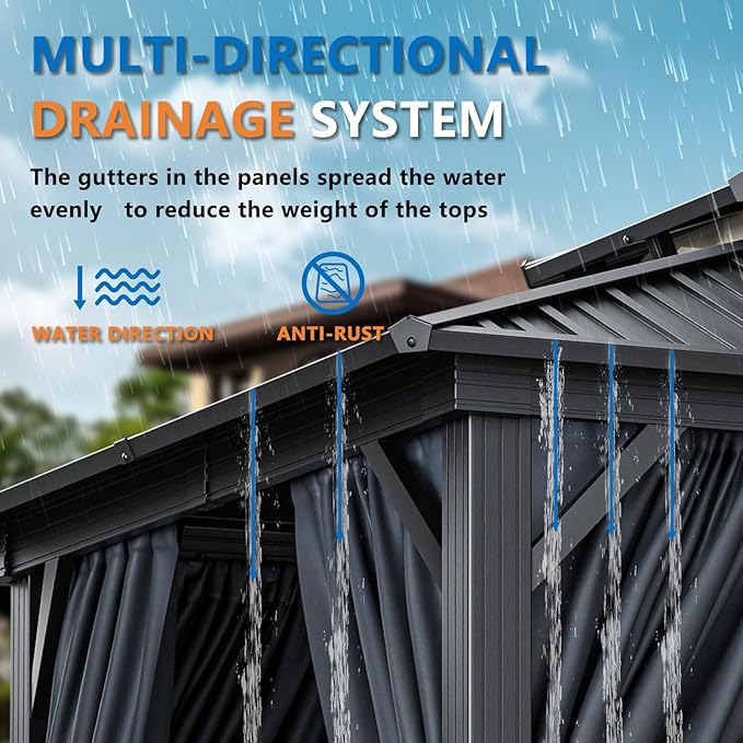 • Ventilated Double Roof: Hoteel 10x15 hardtop gazebo features a heavy-duty galvanized steel roof that provides better protection from harmful UV rays and promotes air circulation and wind resistance. You can even sunbathe under this hard top gazebo without worrying about getting sunburned.