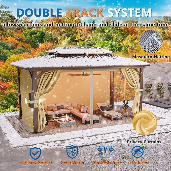 • Human-Centered Design: the patio gazebo features a double-track system for smooth sliding. The CPAI-84 flame-resistant curtains provide excellent privacy and protection against fire, tear, UV rays and rain. The sidewall mosquito netting with two-side zippers and top netting allow for proper ventilation against pests. Equipped with two hooks on the top, this outdoor gazebo can be used to hang the lights or fans to enrich the gazebo for patios.