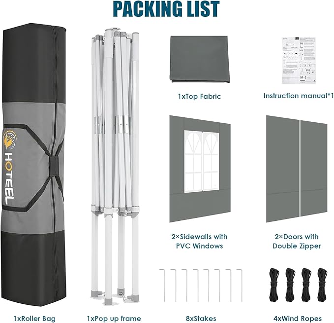 • 🏆【Packing list & After-sale Protection】Pop Up Canopy Frame×1,6.6x6.6 Canopy Top Cover×1,Silver-coated Panels×4 (2xWindows and 2xDoors with Zipper), Ground Nails×8, Wind Ropes×4, Portable Bag×1, Manual×1. We provide warranty service, if you have any questions with Hoteel pop up tent 6.6×6.6, please feel free to contact us. We will solve it for you immediately.