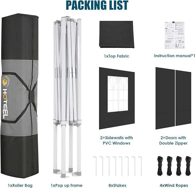 • 🏆【Packing list & After-sale Protection】Pop Up Canopy Frame×1,6.6x6.6 Canopy Top Cover×1,Silver-coated Panels×4 (2xWindows and 2xDoors with Zipper), Ground Nails×8, Wind Ropes×4, Portable Bag×1, Manual×1. We provide warranty service, if you have any questions with Hoteel pop up tent 6.6×6.6, please feel free to contact us. We will solve it for you immediately.