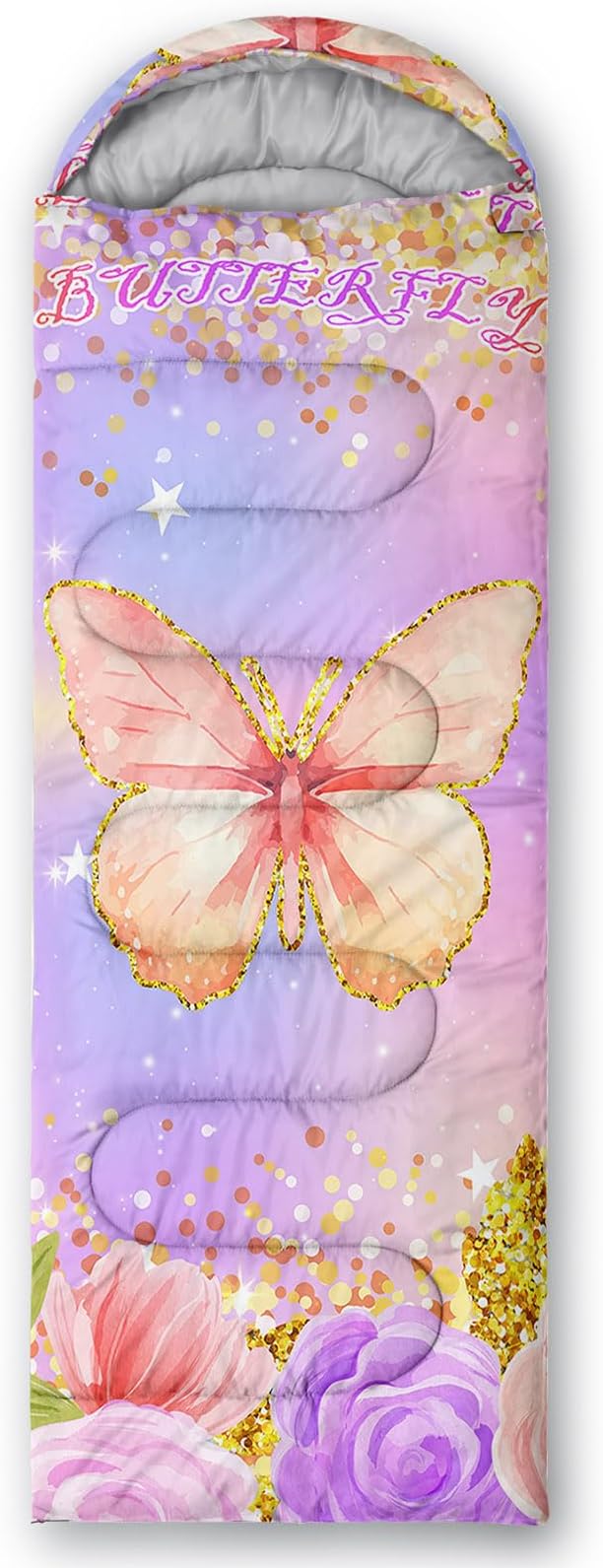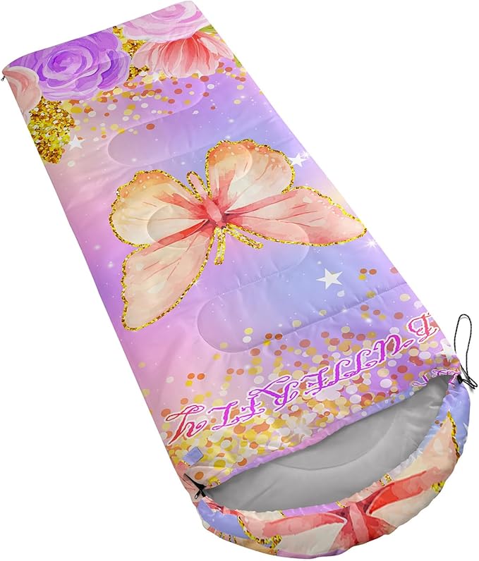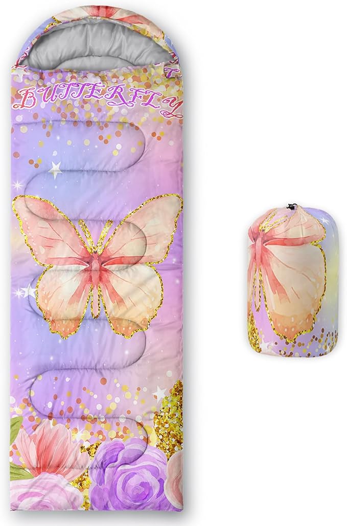 • 【Fashion Design】This camping sleeping bag is designed with a golden grain butterfly and colorful floral,suitable for children who like the theme of animal.This cold weather sleeping bag uses comfortable fabrics to make you feel warm and comfortable.It is camping essentials for outdoor activities.