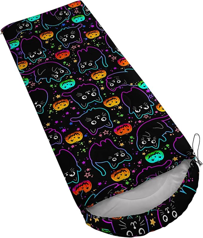 • 【Fashion Design】Various patterens on this black sleeping bag including cats,pumpkins and stars.This cat sleeping bag outdoor is lightweight and waterproof.Not only as camping essentials,but also as a gift,this hiking sleeping bag is a great choice.
