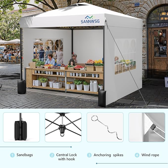 • 【 Enhanced Stability】 – To prevent the pop up canopy from being toppled by strong winds, we've incorporated two-way vents for improved airflow control. Additionally, the canopy tent is reinforced with 4 sandbags, wind ropes, and spiral ground nails, ensuring a secure and stable ground attachment even in harsh conditions.