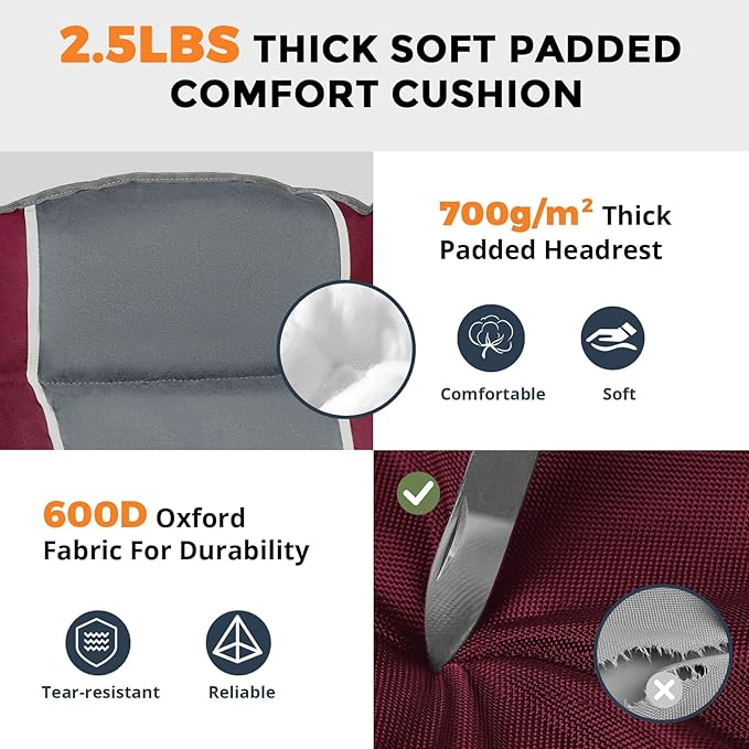 • Ultimate Comfort & Ergonomic Support: The xl camping chair with comfortable padded seat, back and headrest support provide superior comfort during long camping trips, outdoor events, or sports games—perfectly fits larger body frames.