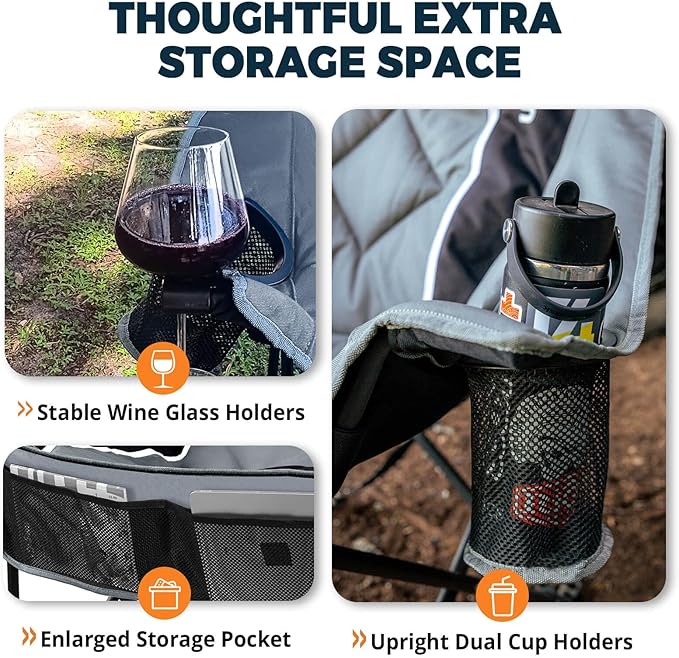 • Convenient Cup Holders & Storage Pockets: Stay organized outdoors. Comes with 2 oversized cup holders, front-facing storage pockets for phones or snacks, and even wine glass holders—designed for maximum convenience at your campsite.