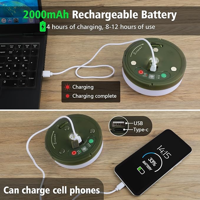 • USB Charging and Battery Indicator‌: The camping light features a built-in 2000mAh rechargeable battery that charges fully in just 4 hours via USB. When fully charged, it provides 5 to 12 hours of continuous operation depending on the selected lighting mode. The clear red power indicator light flashes during charging to show charging status, and remains steady when fully charged for convenient power management.