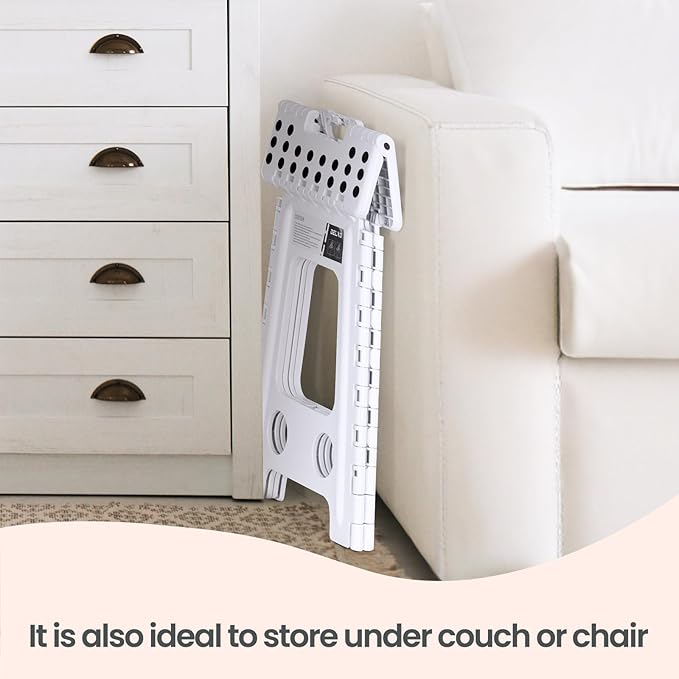 • Space-Saving Folding Stool: Designed to save up to 90% of space when folded, our 17.5” foldable step stool is easy to store under the bed, in a closet, or in tight spaces between furniture, it also fits perfectly in your car trunk—ideal for small apartments and road trips