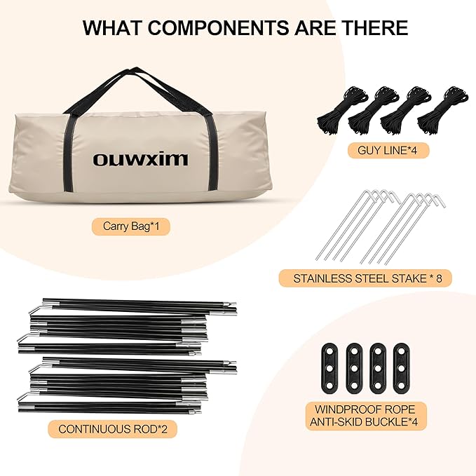 • 【Durable and high quality materials】Portable camping screen tent is made of 210D Oxford cloth, waterproof grade 1000+,Screened tent frame is made of high-strength fiberglass roof poles and side steel poles; it offers you a great sense of protection and security from the elements