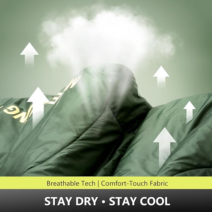 • 【No-Clump Design】Our sleeping bag features new stitch that prevents insulation migration, ensuring even heat distribution without cold spots. The reinforced stitching construction maintains structural integrity through multiple machine washes, keeping the filling perfectly distributed and preventing clumping - so your warmth stays consistent trip after trip