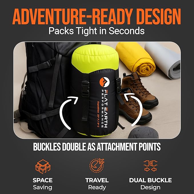• Upgraded Compression Sack – Most camping sleeping bags include a simple cinch sack. Ours adds two compression buckles so you can fully tighten the pack-down—cutting bulk for easier transport in a car, kayak, or hiking pack.