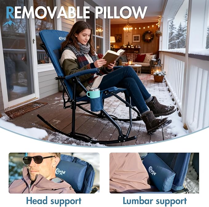 • 29" High Back Support: This camping rocking chair has a 29" high padded backrest fully supports shoulders & head for relaxing comfort. It also comes with side pockets and a cup holder for added convenience outdoors.