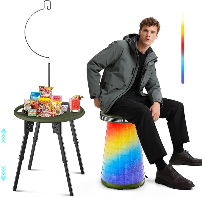 • 【Multi-Function LED Stools】 The collapsible stool features built-in LED lights with three practical modes - steady warm light for illumination, festive breathing light for parties, and SOS strobe for emergencies - all controlled with a simple button press(battery not included).