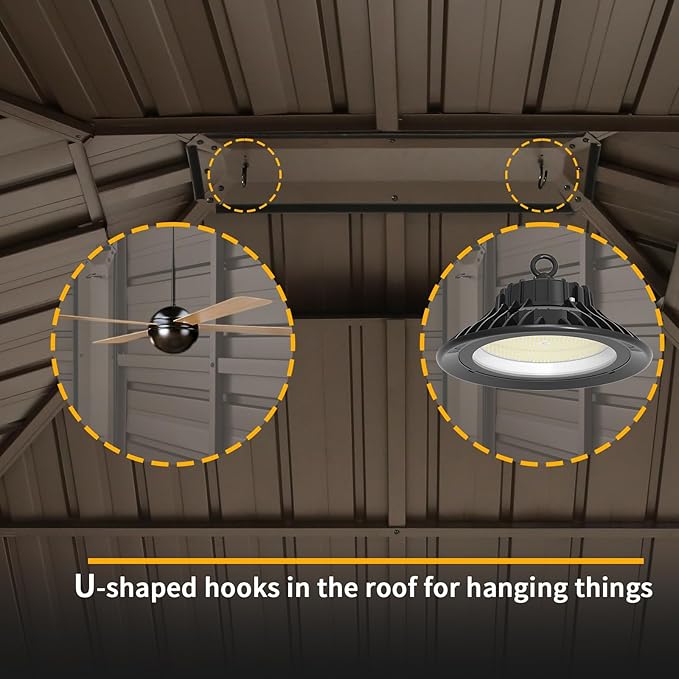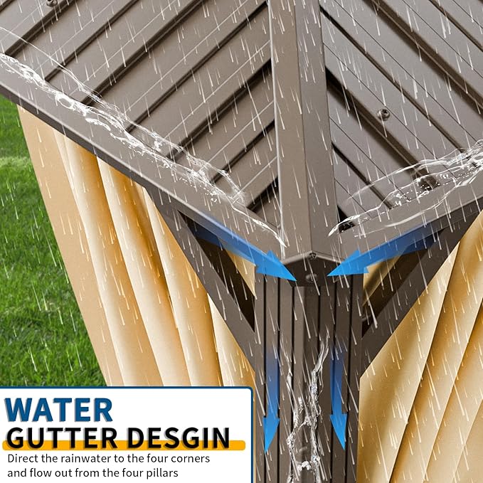 • Ventilated Double Roof:Hoteel 10x12 gazebo features a heavy-duty galvanized steel roof that provides better protection from harmful UV rays and promotes air circulation and wind resistance. You can even sunbathe under this hard top gazebo without worrying about getting sunburned.Can withstand heavy snow loads up to 18.43 psf.
