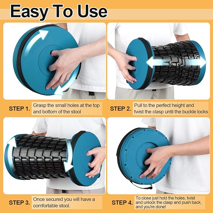 • SAFETY AND DURABLE: The collapsible stool for adults is made of thickened pp material and has a safety latch design that prevents it from accidentally slipping out when folding/closing, and the non-slip design on the bottom also increases the safety of the user.