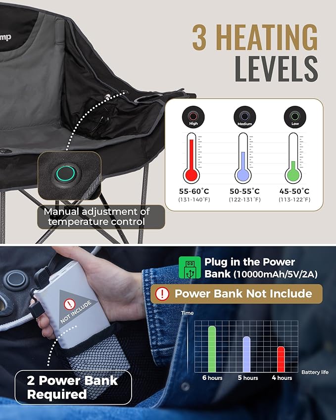 • 【Power Bank Not Included】Please note: Power banks are NOT INCLUDED.Heating performance depends on battery capacity and outdoor temperature, and warmth experience can vary by individual.For optimal results, it is recommended to use two power banks with USB outputs rated at 5V/2A.The larger the capacity of a power bank, the longer the heating duration.For your safety, this chair will automatically shut off after 150 minutes of operation.