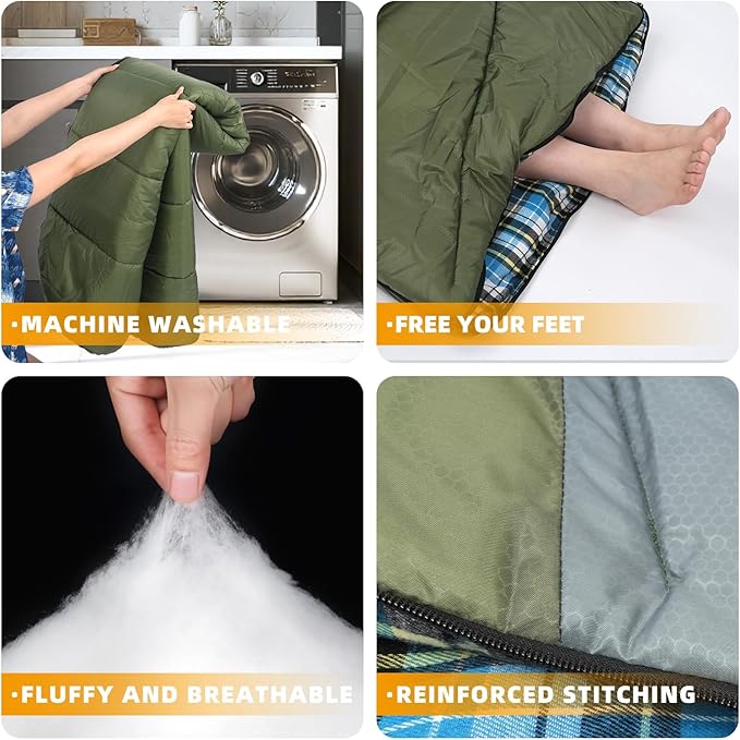 • PLENTY OF SPACE : Sleeping Bag Size 86.6 inch x 32.48 inch. Pack Weight is 4lbs, the compressed packing size is 11''-15.7'' and would take up less space. High-quality three zipper give you more comfortable camping experience.