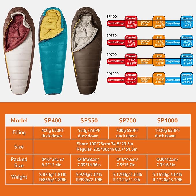 • Sizes and temperatures available: There are three models of SP400/ SP700/ SP1000 available, corresponding to the comfort temperature scale of 38.84/ 18.86/ 12.55℉ respectively. Each model is available in short and regular sizes: 74.8 x 29.5in and 80.7 x 31.5in respectively, please refer to the size pictures for the exact storage size and weight of each model. You can choose the best sleeping bag for outdoor ambient temperature