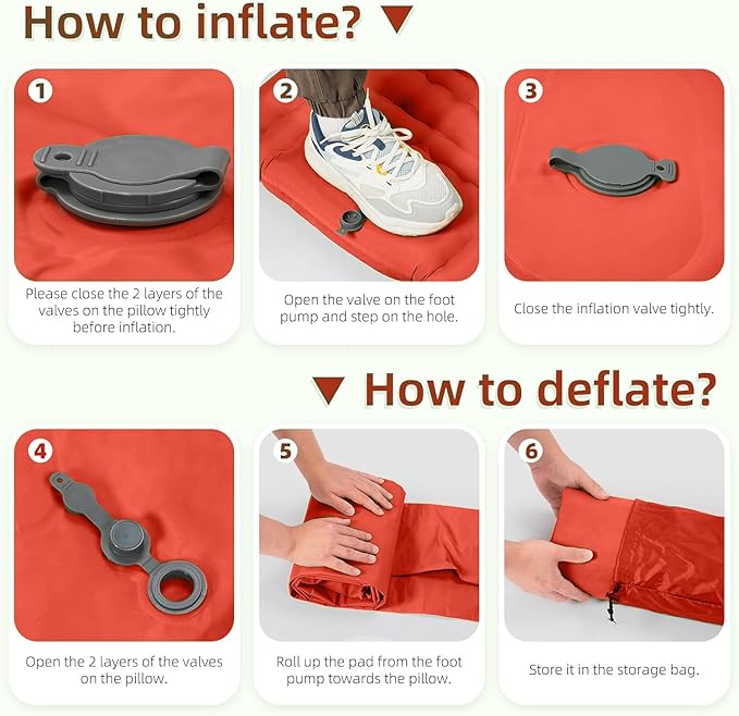 • 【Only 30s Step to Inflate & 1s Deflate】 Including an innovative built-in foot pump- Just pedal 30-60s to fully inflate the camping mat, which is convenient and easy, no longer need to inflate with your mouth, hands or carry a pump, and it only takes 1 second to quickly deflate. With the upgraded version of the air release valve with no leaking film, you shall never worry about air leaking!