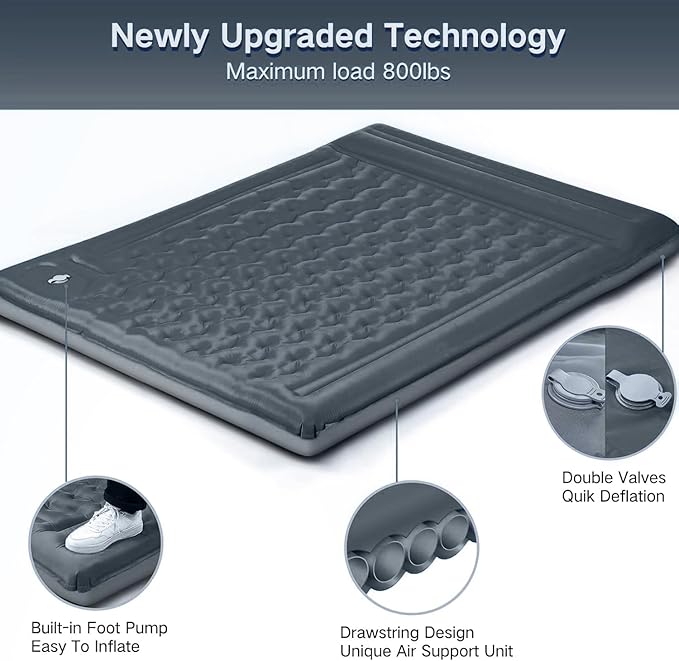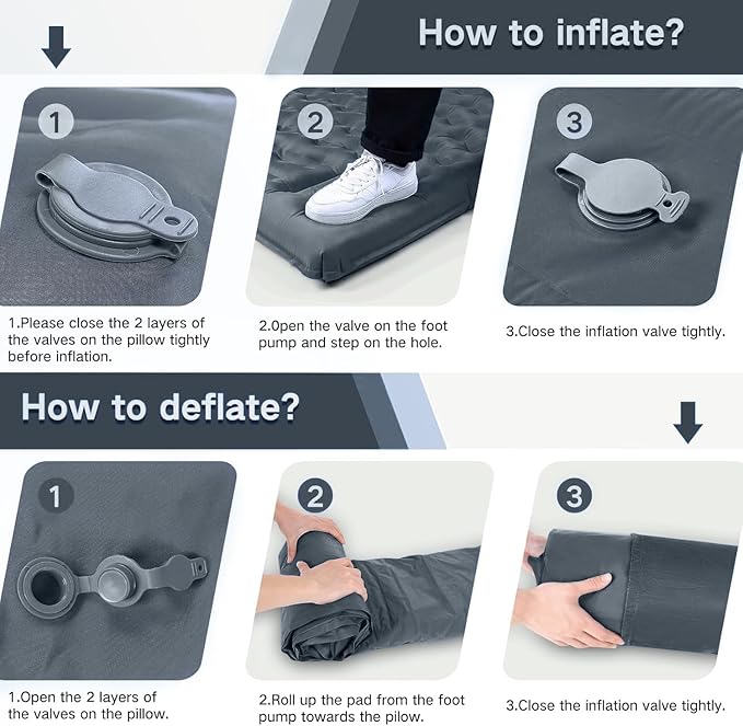 • BUILT-IN FOOT PUMP: No mouth blowing, no extra pump, FNARMW wide sleeping pad features a built-in foot pump. It takes only 3mins to fully inflate this thick queen sleeping pad by foot pressing, no mouth, no hands, clean and hygienic, even kids can finish inflating. Two double layer valves on the pillow can effectively prevent air leakage and achieve rapid deflation, just remember to close the valves tightly before inflation. NOTE: the inflation time depends on the speed of your foot pressing.