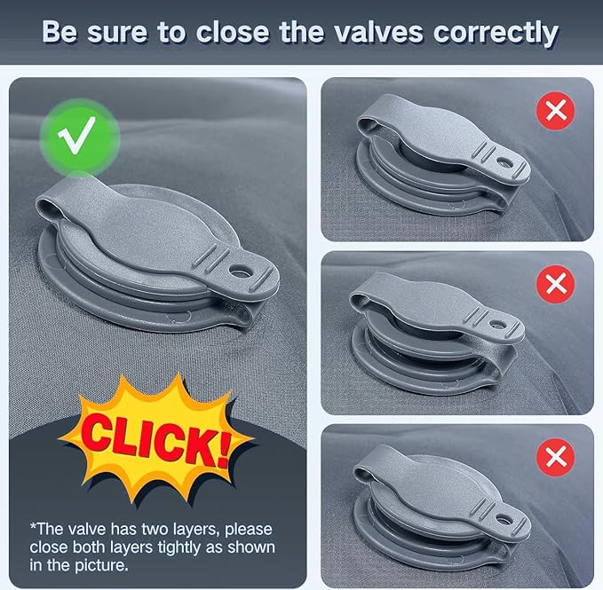 • Note:We have 2 double-layered valves on the one-piece pillow of the sleeping pad. Please close the valves tightly, and check the valves first if you find any leaking.